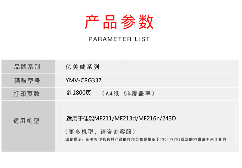 億美威 YMV-CRG337 適用于佳能MF211/MF213D/MF216/243D 全國(guó)統(tǒng)一價(jià):178元
