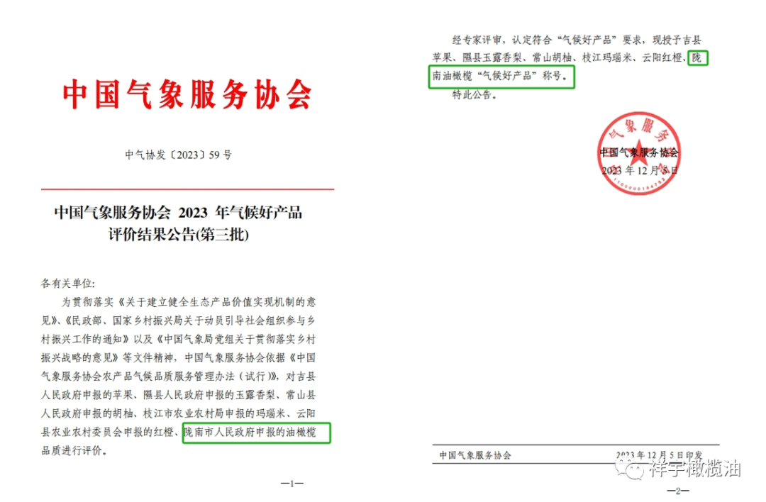 隴南油橄欖榮獲2023年“氣候好產品”稱號