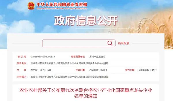 12月15日,農(nóng)業(yè)農(nóng)村部發(fā)布《關(guān)于公布第九次監(jiān)測合格農(nóng)業(yè)產(chǎn)業(yè)化國家重點(diǎn)龍頭企業(yè)名單的通知》。